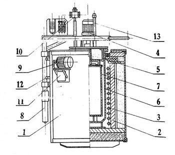 1、炉壳 2、炉衬 3、加热元件 4、通风机构 5、炉盖 6、炉罐 7、装料筐 8、液压机构 9、油泵 10、滴量器 11、油捅 12、行程开关 13、排气管